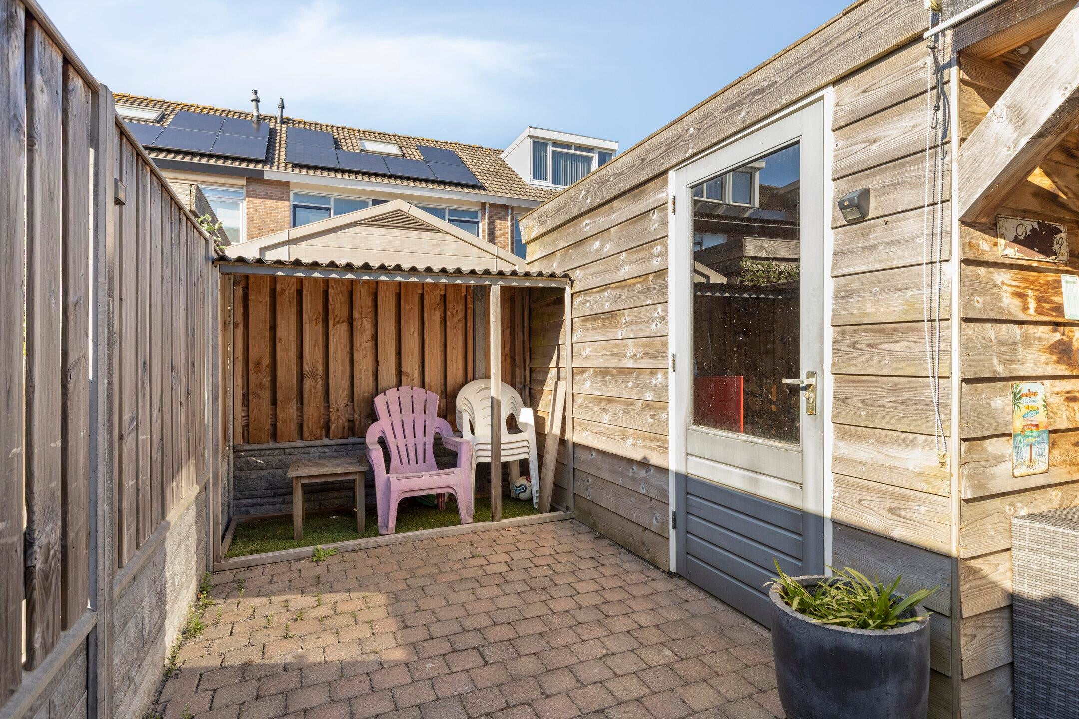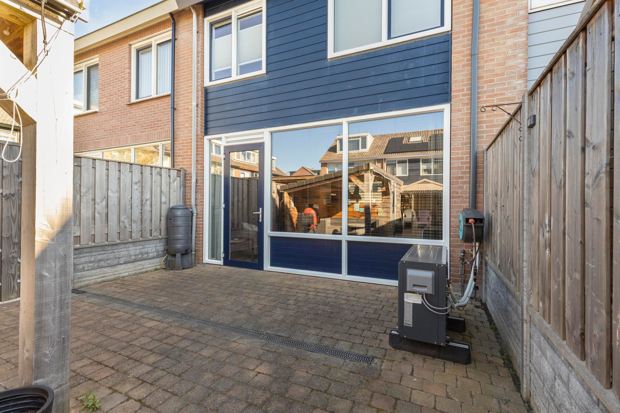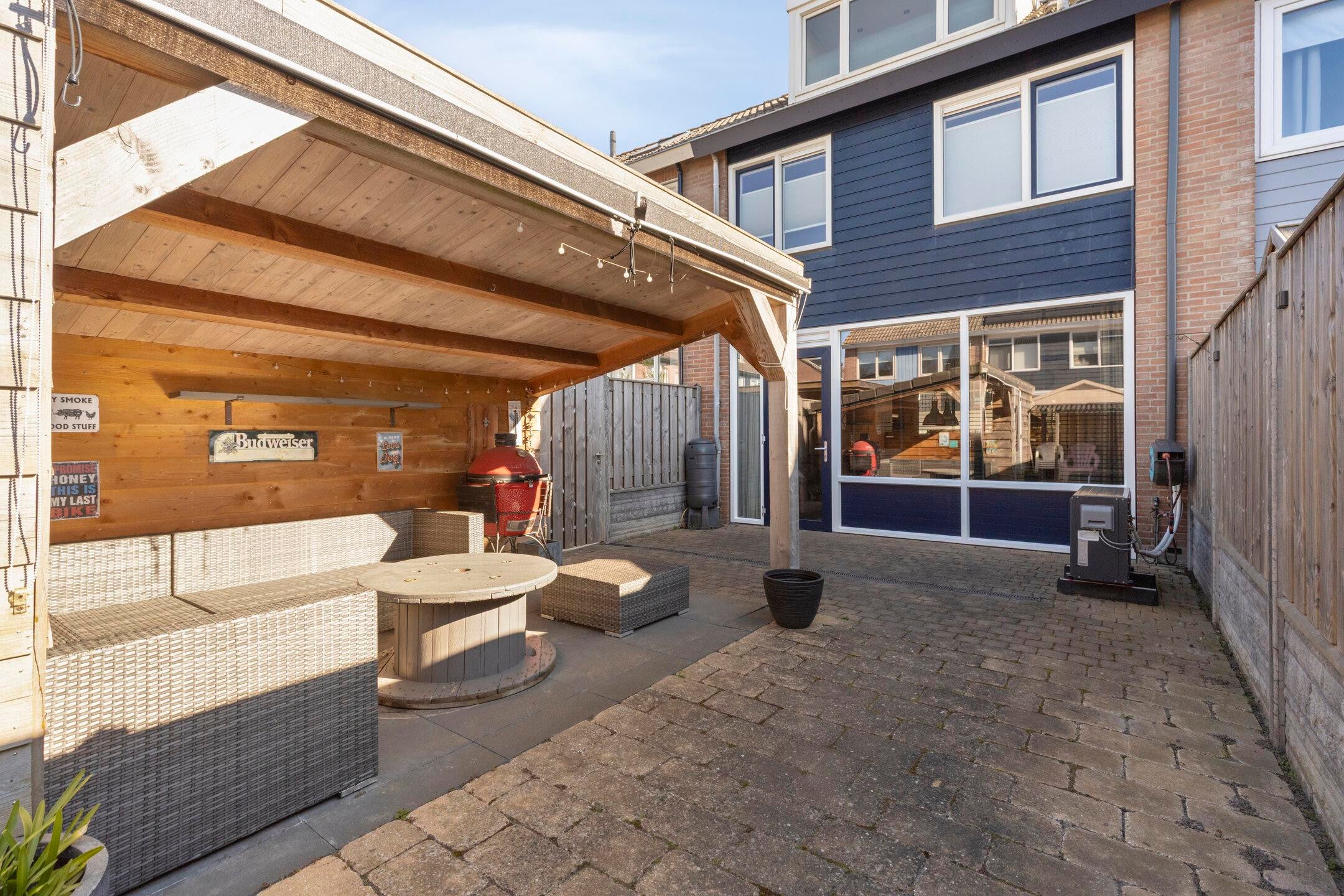De achtertuin is onderhoudsvriendelijk aangelegd en voorzien van een overkapping en berging. Dit maakt het mogelijk om ook buiten comfortabel te verblijven.