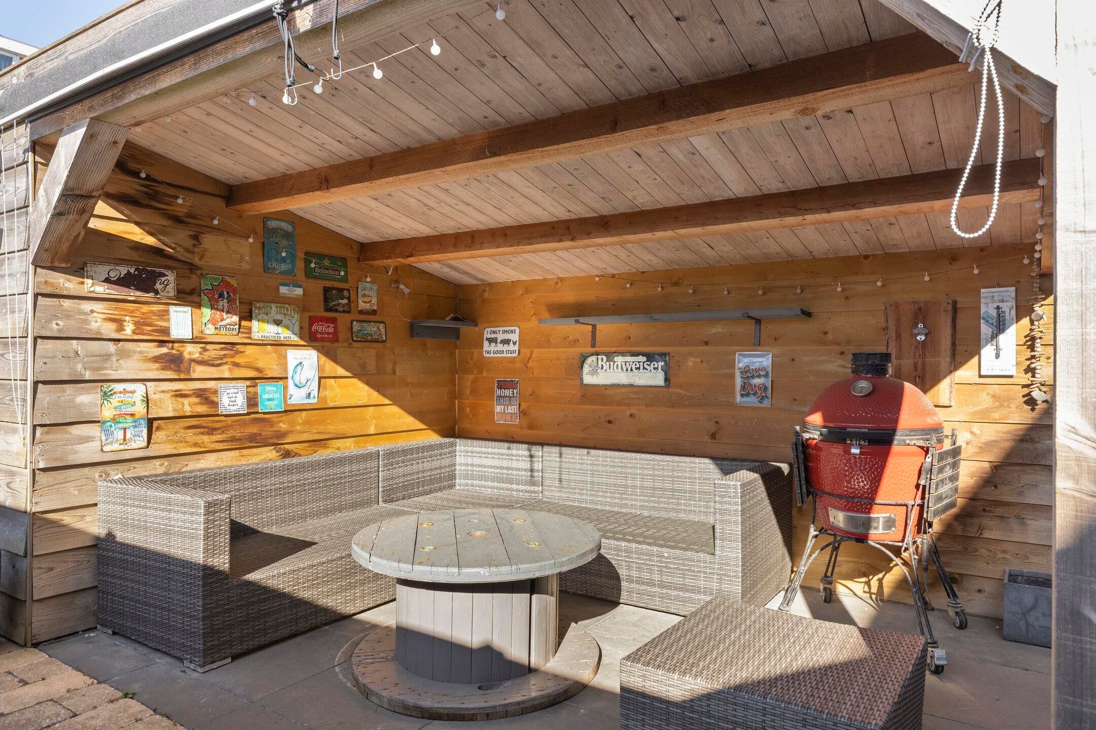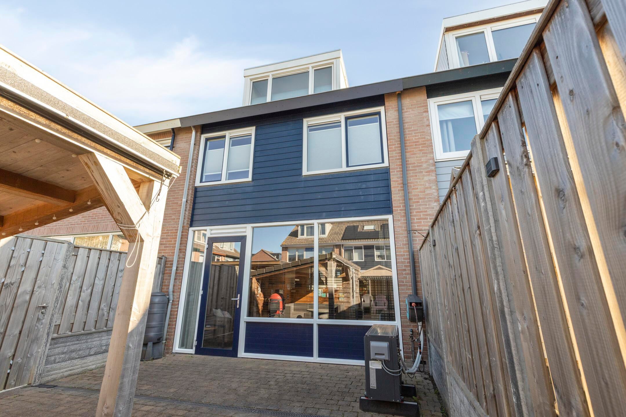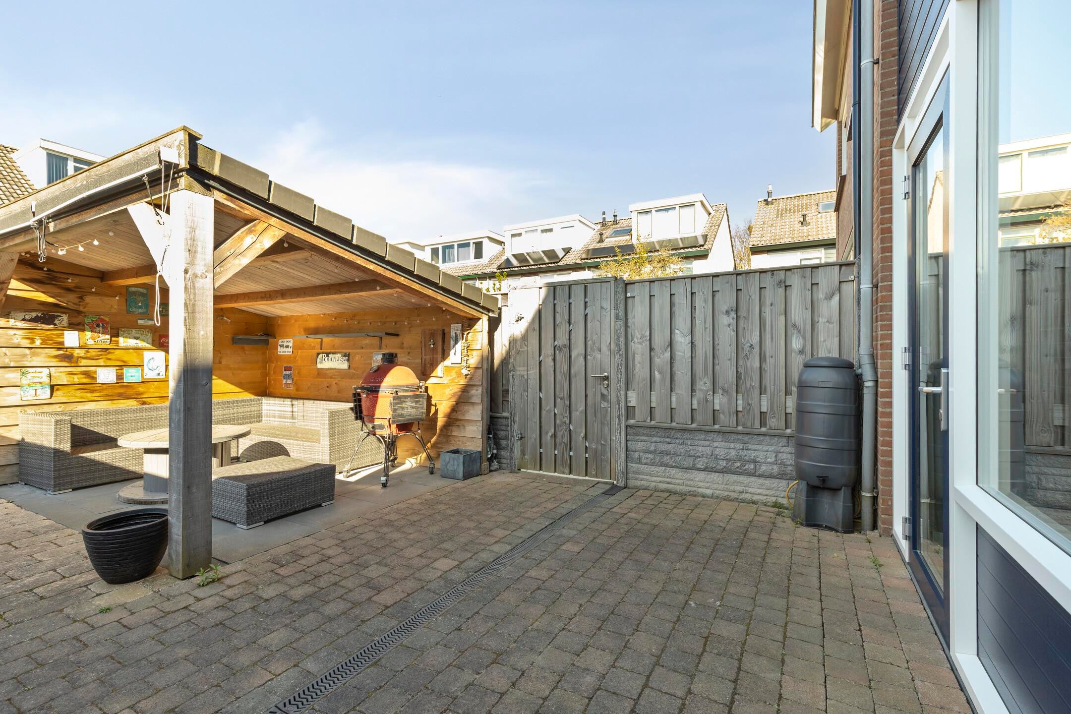 De achtertuin is onderhoudsvriendelijk aangelegd en voorzien van een overkapping en berging. Dit maakt het mogelijk om ook buiten comfortabel te verblijven.