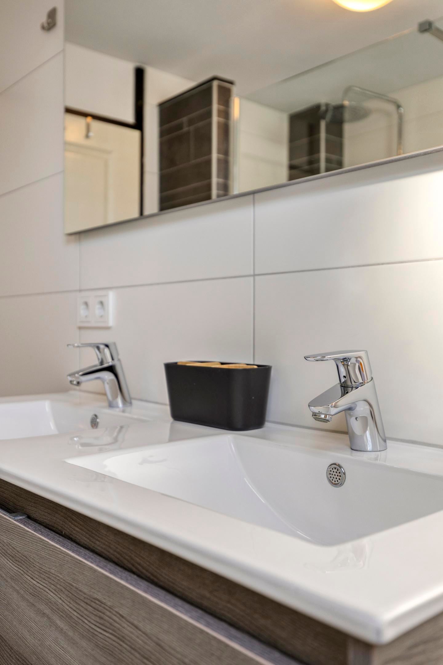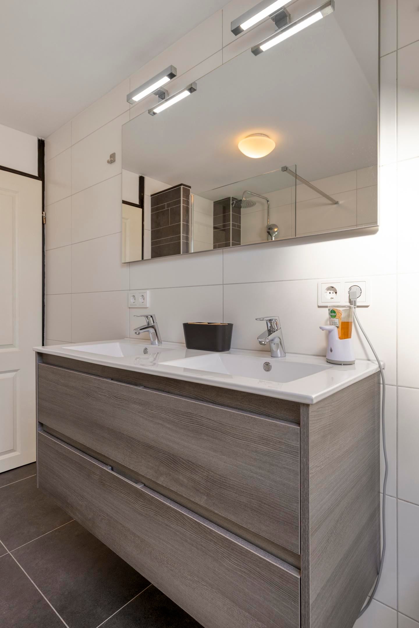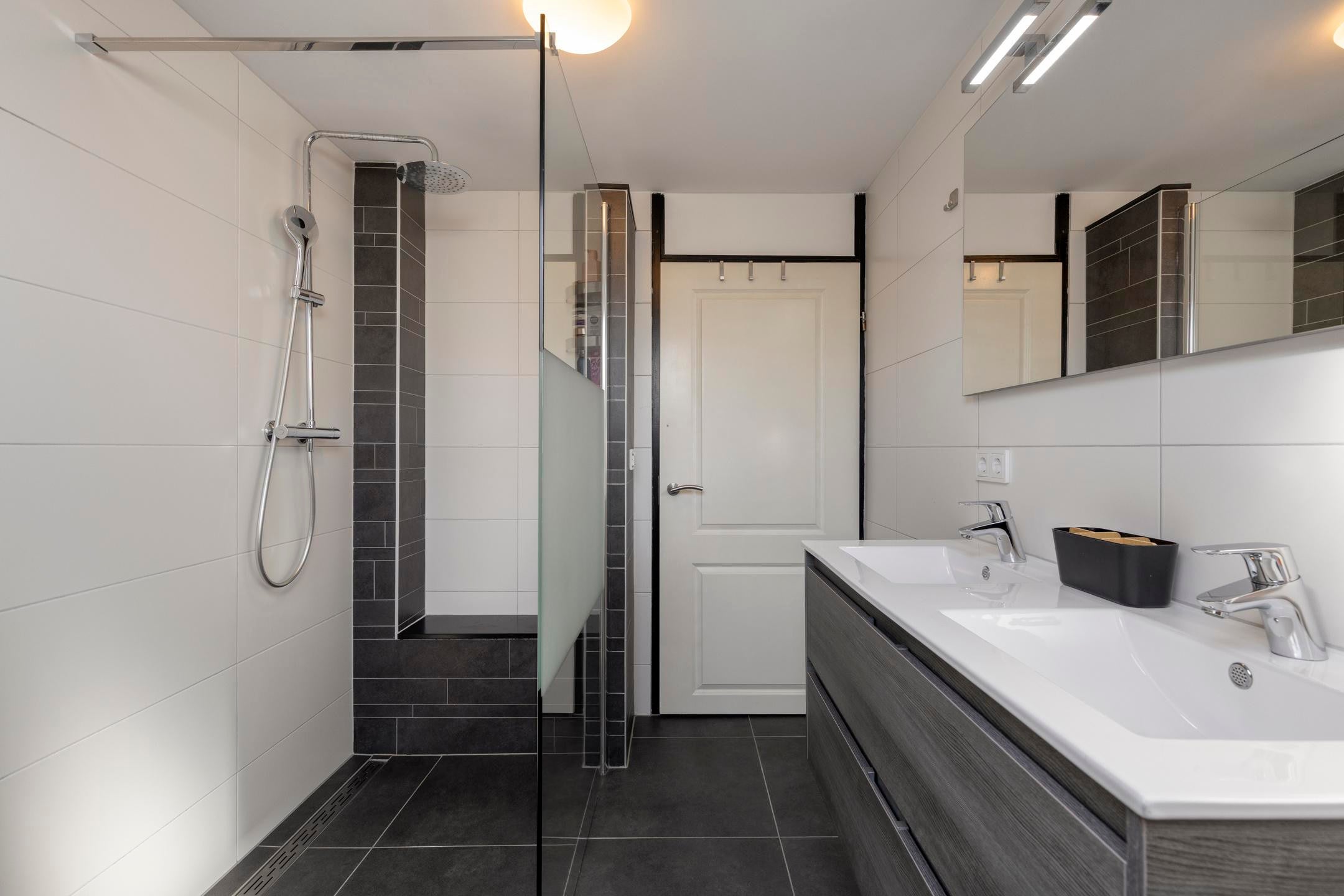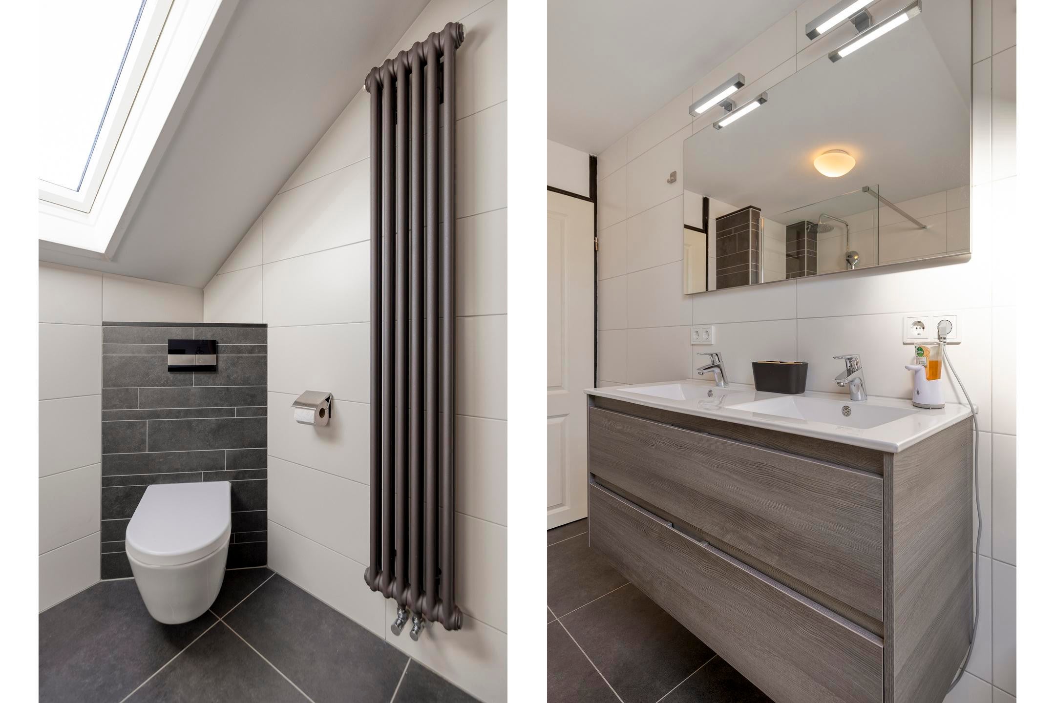 Op de verdiepingen bevinden zich meerdere slaapkamers, geschikt voor een gezin of voor een combinatie van wonen en werken. De badkamer is modern uitgevoerd en voorzien van een inloopdouche en een dubbele wastafel. De woning beschikt daarnaast over een separate toiletruimte.